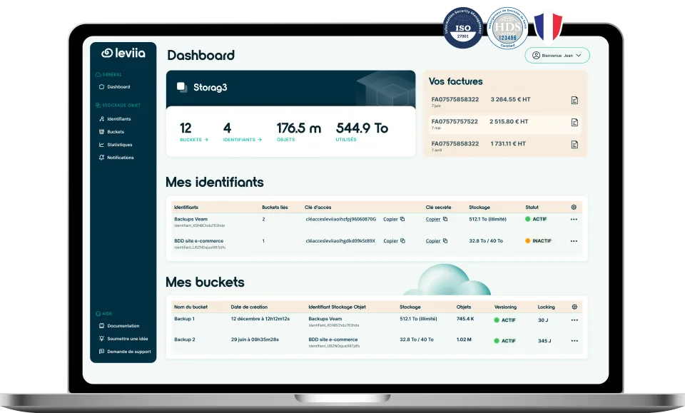 Notre stockage S3 est certifié ISO27001 & HDS. Géo-répartition des données sur 3 zones distantes, versioning, locking, chiffrement en envoi, système anti-DDos, protection contre les ransomwares.